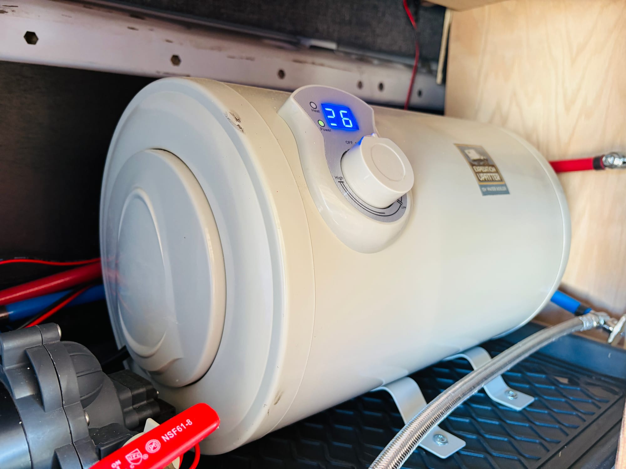 The 20-gallon tank is located on the rear driver side, easily accessible through the custom cabinets. It features an outdoor shower sprayer, a simple hose connector, and a 2-gallon hot water tank that takes about 10 minutes to heat. It's also very easy to winterize if we stop traveling in the colder climates.