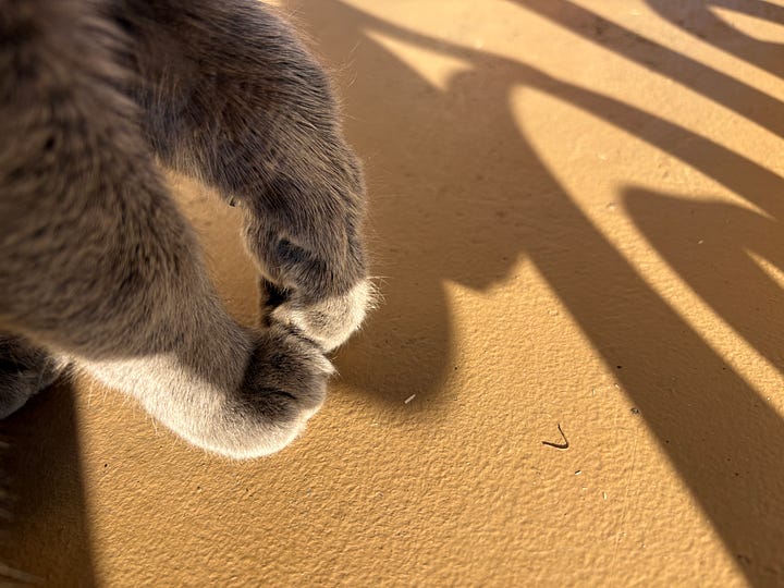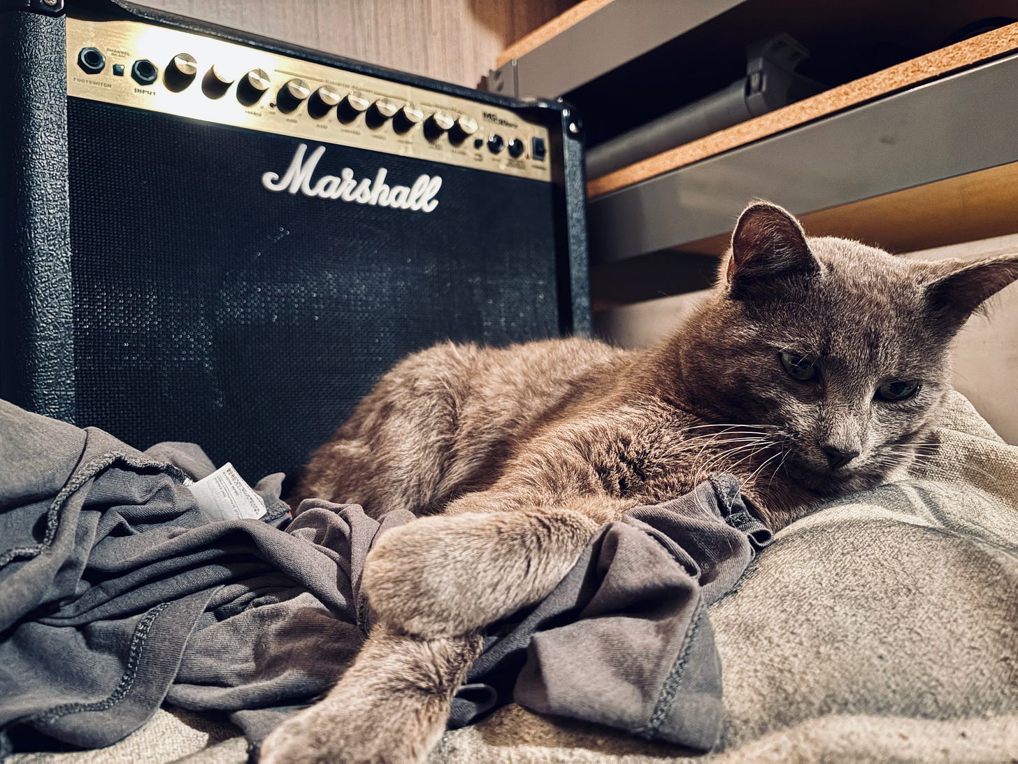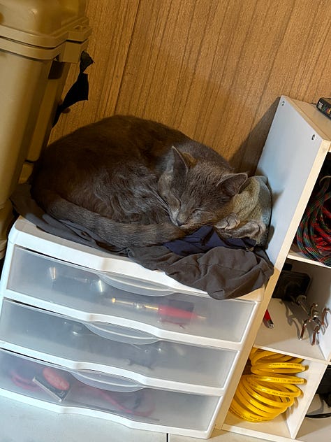 If weāre outside, he always finds us and asks for love and affection, while ātalkingā to us constantly. When we go inside, heāll jump onto the window ledges to stare at us, looking like he wants to join the family. Sometimes when Iām working in the garage, heāll jump onto the buckets to take a nap while listening to the Grateful Dead.