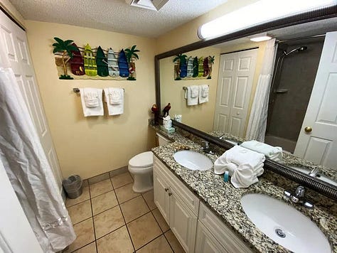 Walking in, we were greeted by a mermaid and her bosom (not a bad start) and a very beachy vibe. There’s a long hallway that leads to the bathroom, bedroom, living room, and kitchen. The bathroom was clean, bright, and spacious.