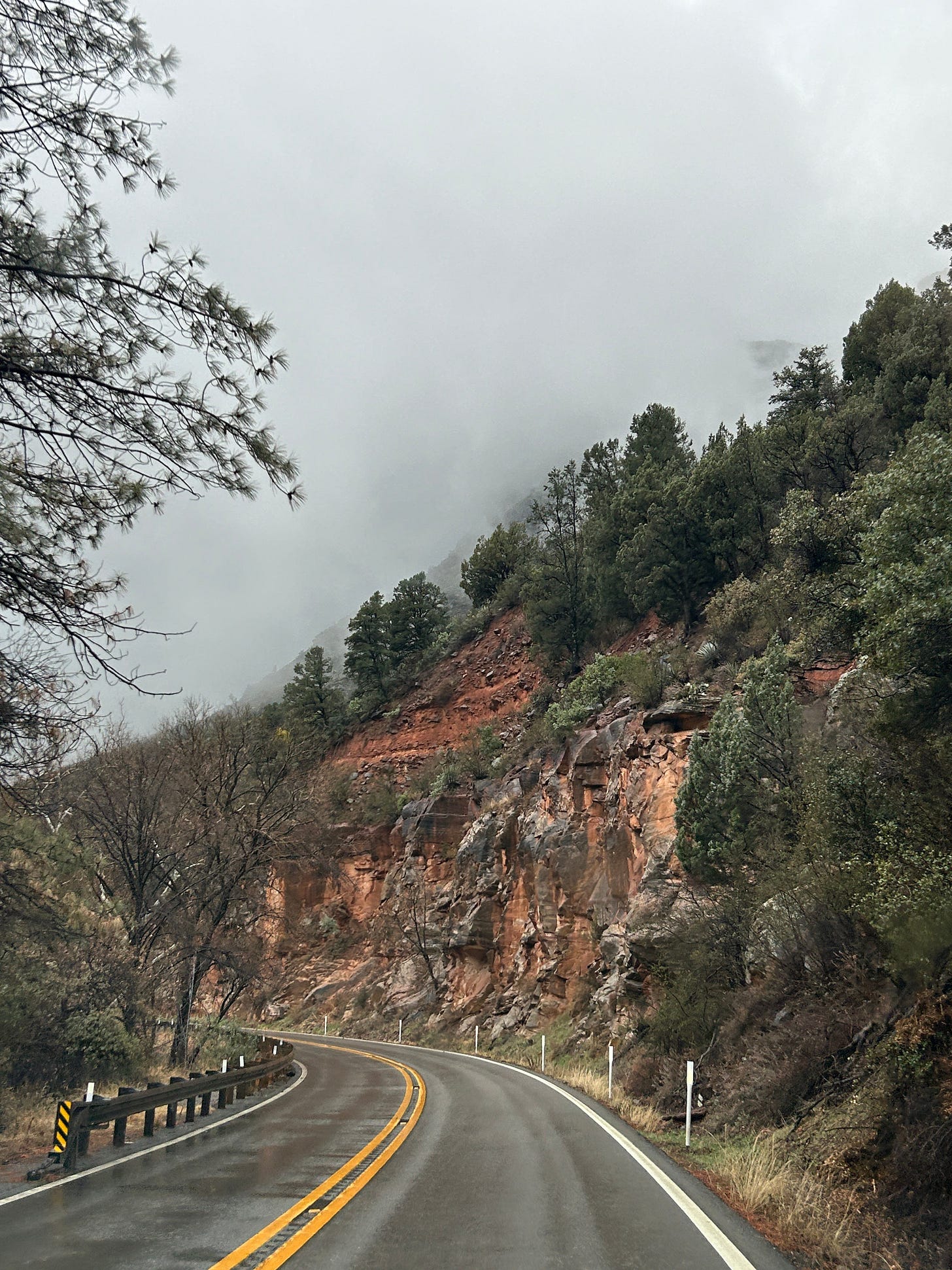This drive is Highway 89A between Flagstaff and Sedona in Arizona. The funny thing is, the first couple of times we visited Sedona, we were hesitant to drive this road because we knew it was through the mountains and there were some switchbacks along the way. We had driven some other switchbacks in a couple of different places that were terrifying to us, so we were kind of afraid to give it a try. We ended up taking the longer route around on I-17. That route is still beautiful, but it’s not the same.