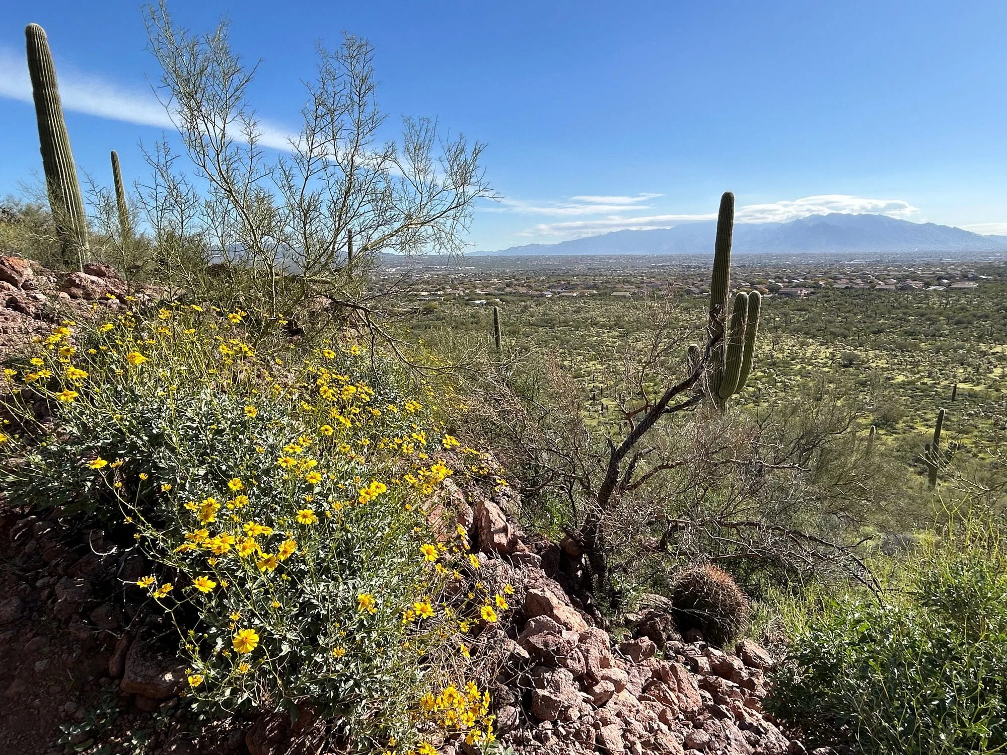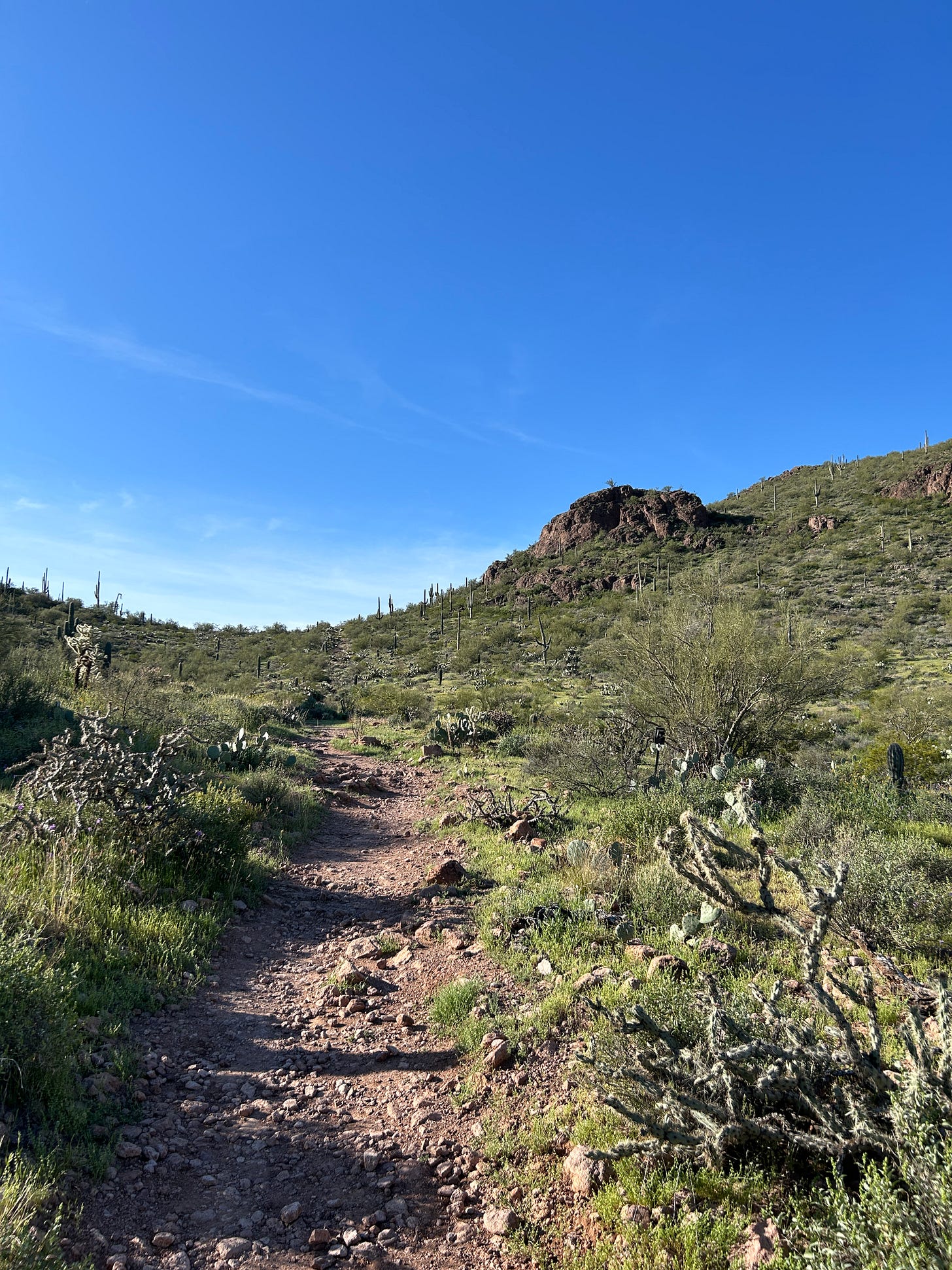 Before we drove out of town the next morning, we wanted to stop and do a hike. We stopped at the very northern edge of the west side of Saguaro National Park and chose a spot with beautiful views. It did not disappoint! Even the drive there was pretty! It was tucked back on a dead-end road that basically went through a beautiful little neighborhood. We saw quite a few people out for their morning walks. I can’t imagine living in a place where you can step outside your home and walk with views like this. So amazing!