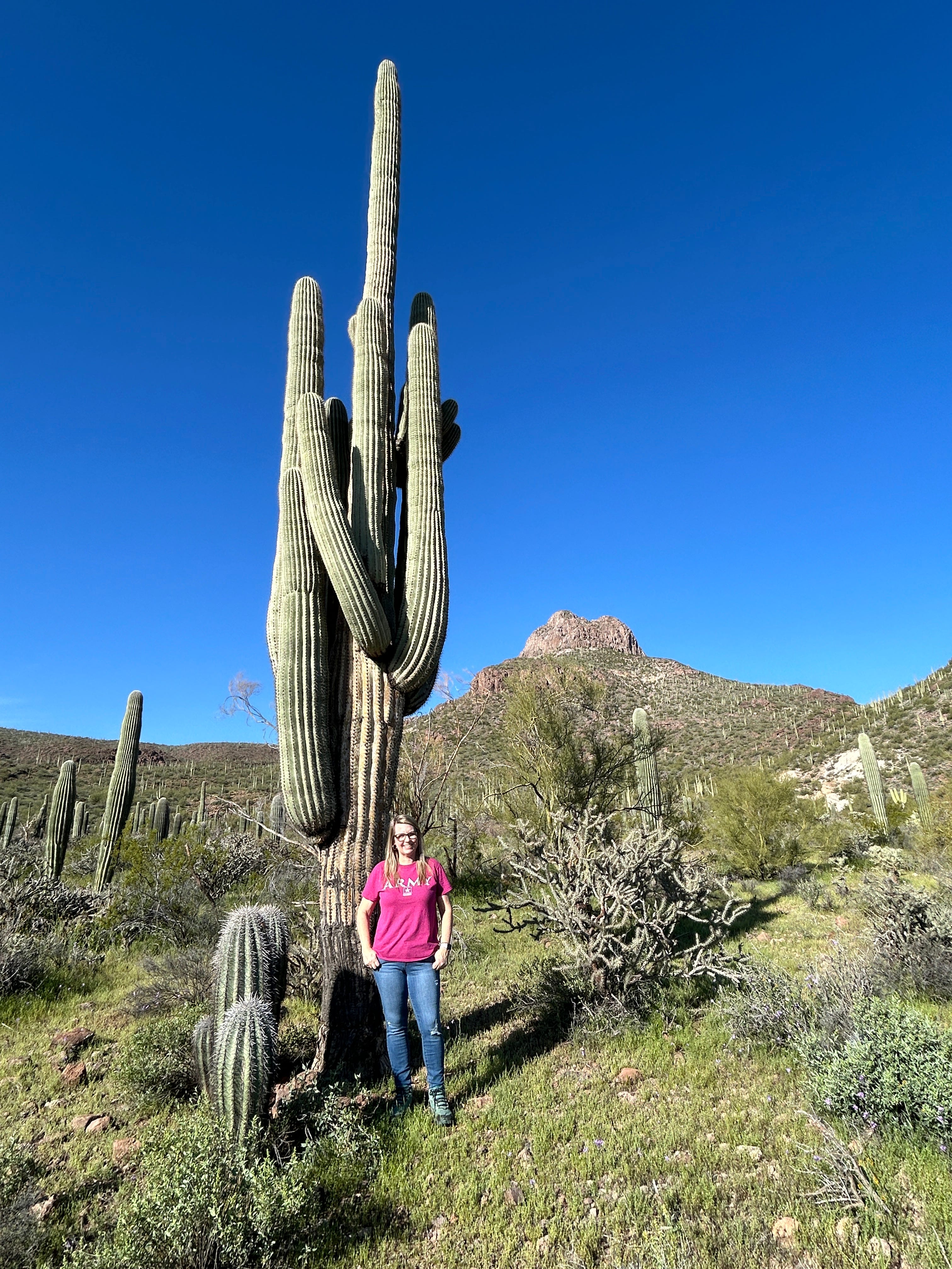 We always joke that we never would have thought we’d find the desert beautiful before we started traveling so much, but now that we’ve spent a good amount of time in the desert over the last 4 years, we definitely love it. It’s fun to see the different kinds of plants that exist in various climates. The saguaros are always interesting because they can have so many different shapes. We saw some of the biggest ones we’ve ever seen on this hike.