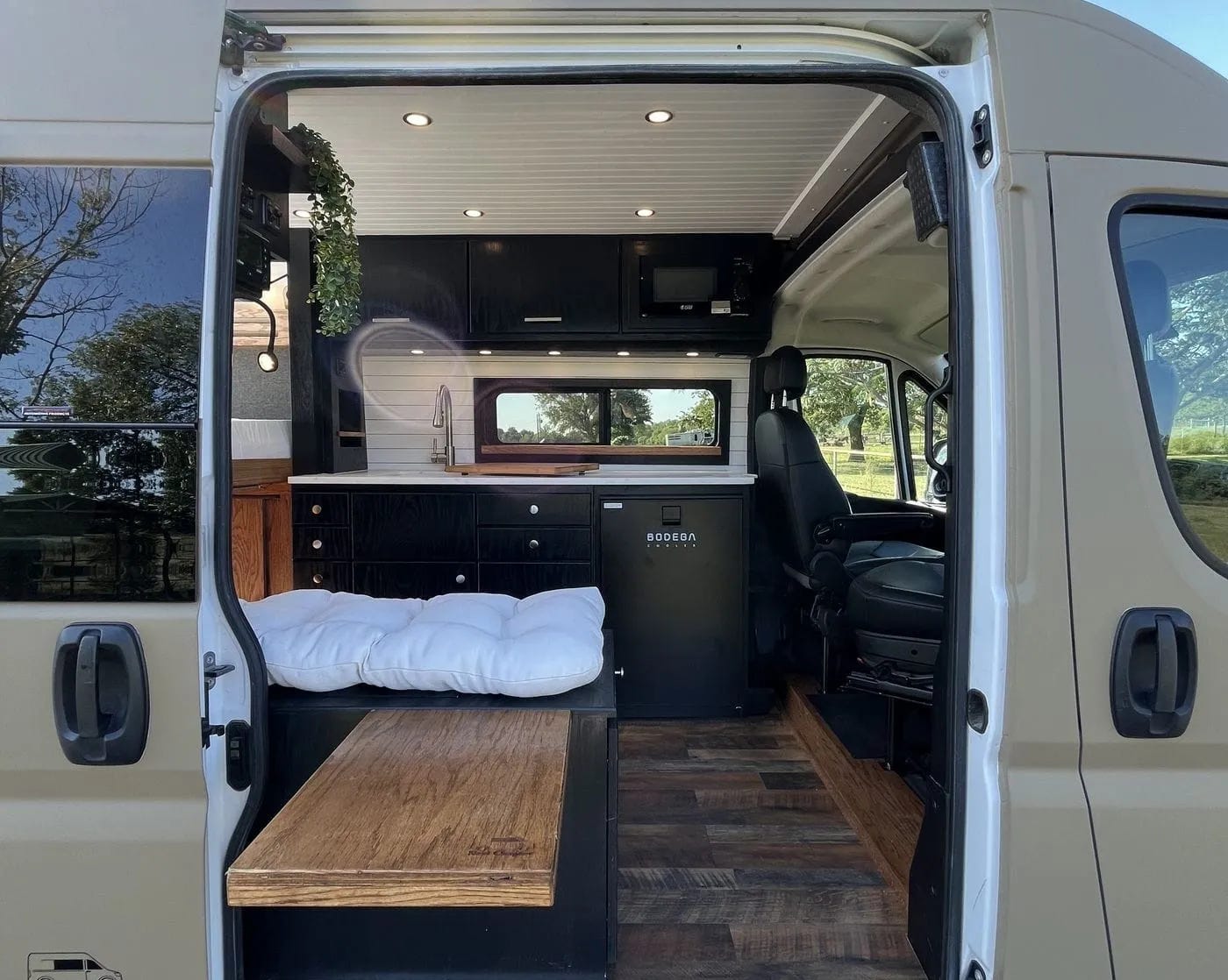 Next Chapter Vans includes a smaller fridge in the buildout price, but because we travel full-time, we opted for a larger Bodega upgrade for $250. The downside is that there still isn’t enough space, and it doesn’t always perform well, so we’ve brought our BougeRV CRD Portable Dual Fridge for meat, ice cream, and extra beers.