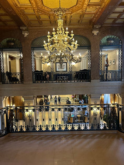 The outside of the hotel was just stunning. We had a lot of fun figuring out which windows were ours. Haha! We stood out in the courtyard a couple of times, looking at the windows, and then we’d look from the inside to figure out exactly where we were. I’ve got a pic here with an arrow pointing to them. And in the next pic, with the front view looking down the sidewalk, the windows at the top are ours.