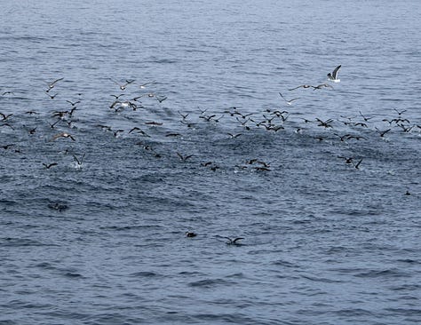 Along the way, we saw huge pods of dolphins that swam alongside us, leaping and playing in the water. It was so incredible to watch. We even saw a feeding frenzy with the birds on the way back. They dive into the water and eat the fish until they're stuffed full. They said sometimes they eat so much they can’t take off and fly because they’re too heavy. 😳