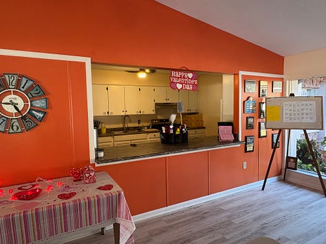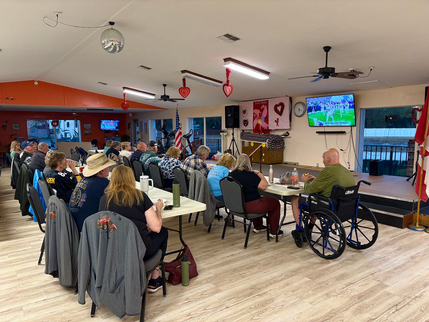 Later in the evening, we attended their Super Bowl party in the community center, where 40 or so residents gathered to enjoy a meal together. Even some of the 75+ crowd brought booze and were sipping on bourbon or whiskey. It was a jovial time filled with laughter and fun. There was no drama, no arguments, no politics. I absolutely loved it — especially when their oldest resident, a cute 96-year-old woman, made an appearance in her community of friends as she lovingly carried a stuffed gnome dressed like a New England Patriot. She really warmed my heart with a smile!