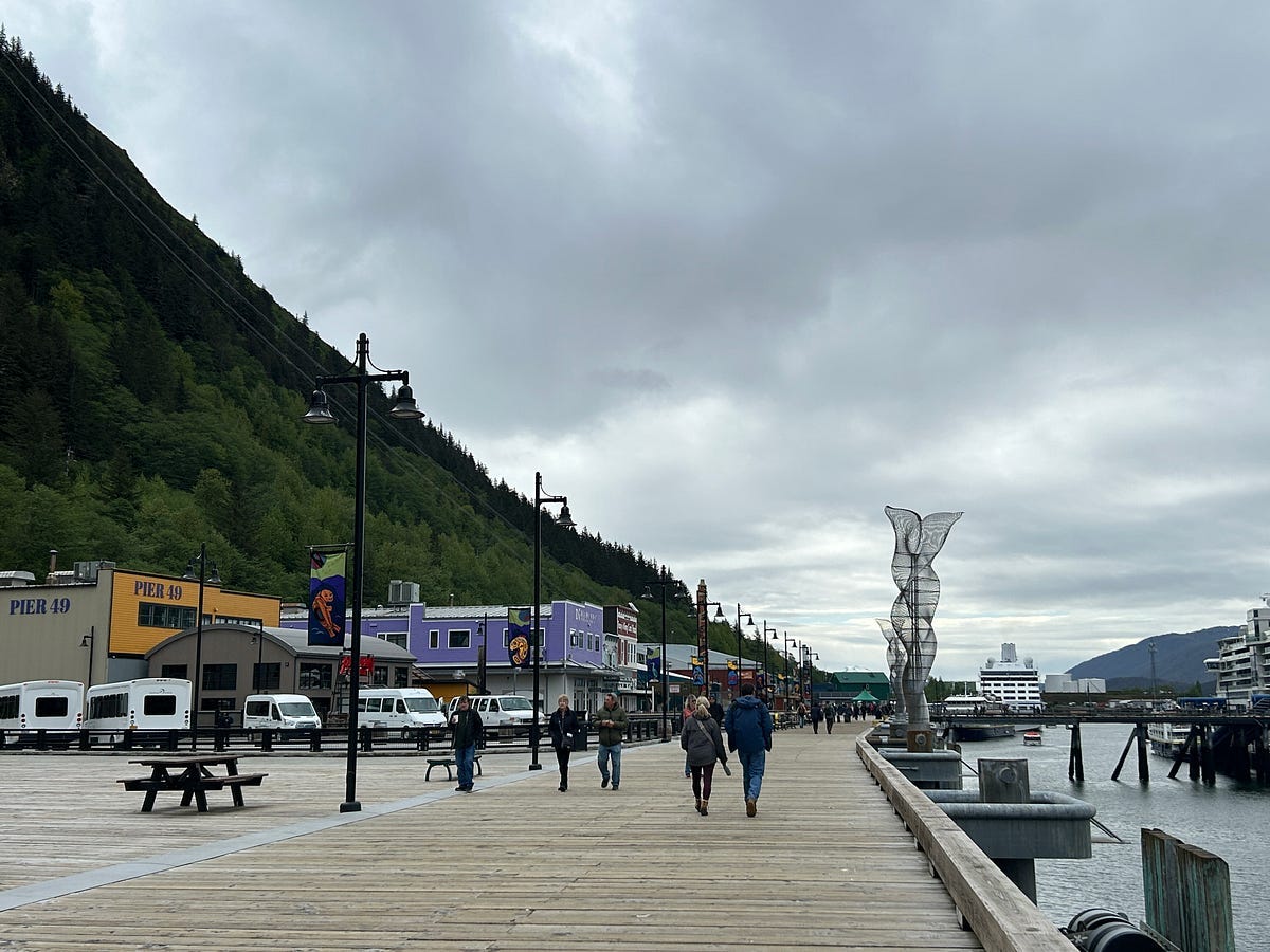 In Juneau, we enjoyed walking around downtown, strolling the boardwalk, and heading down to the area to see the humpback whale statue — The Whale Project. Juneau is a beautiful town and one we really enjoyed!