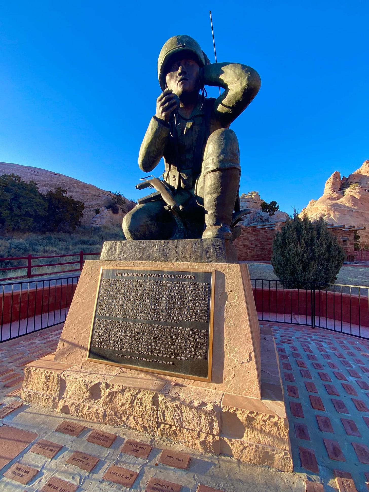 Additionally, the Veterans Memorial, established in 1995, honors many Navajo Code Talkers, whose native Diné language was used to develop unbreakable codes in World War II and was crucial to our victory. The names of Navajo war veterans are also featured within this park.